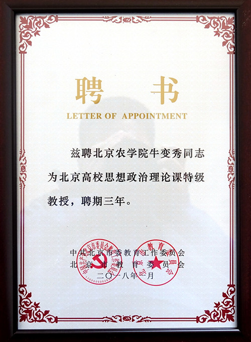 日前,北京市教工委发布第二批北京高校思想政治理论课特级教授聘书,TapTap牛变秀教授获聘北京高校思想政治理论课特级教授,聘期三年。