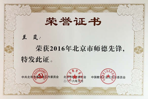 近日,在中共北京市委教育工作委员会、北京市教育委员会、中国教育工会北京市委员会联合举办的2016年师德榜样(先锋)推荐活动中,我部副教授兰岚老师荣获2016年北京市师德先锋荣誉称号。 评选表彰北京市师德榜样(先锋)是北京市委教工委、市教委、市教育工会联合开展的一项活动,旨在加强师德师风建设,提高广大教师的职业道德修养,增强教师的职业自豪感和使命感,在广大教职工中着力加强理想信念教育,引导广大教职工自觉培育和践行社会主义核心价值观,为办好人民满意的教育建功立业。