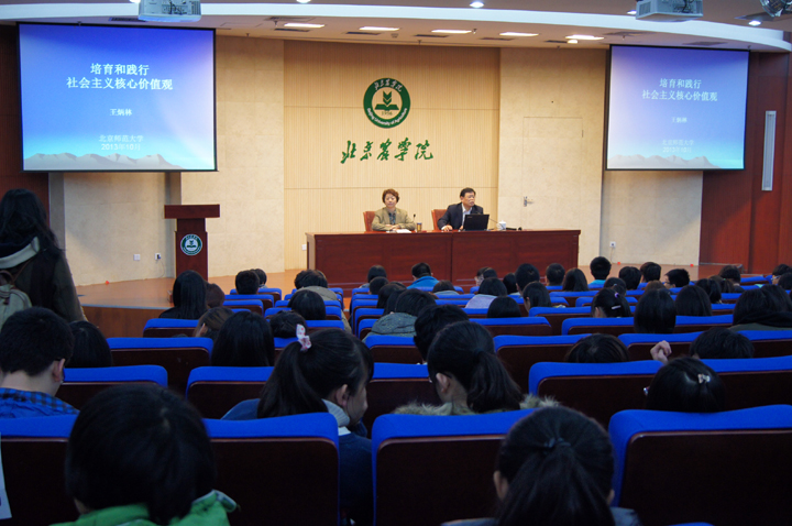 报告会上,王炳林教授围绕“社会主义核心价值观的凝练过程、全球化带来的机遇和挑战、如何培育和践行社会主义核心价值观”三个方面,详细阐述了社会主义核心价值体系、价值观的内涵,分析了我国在现代世界中文化交流的弱势现状,提出了凝练社会主义核心价值观以及坚持“文化自觉、文化自信”的必要性。他认为,培育和践行社会主义核心价值观,要从以下四个方面着手:进行马克思主义立场、观点和方法的教育,坚持中国特色社会主义共同理想,传承中国传统价值的精华,借鉴世界文明成果,符合人类最美好的价值追求;在中国梦的引领下,共同追求“自由、公正、民主、和谐”。
