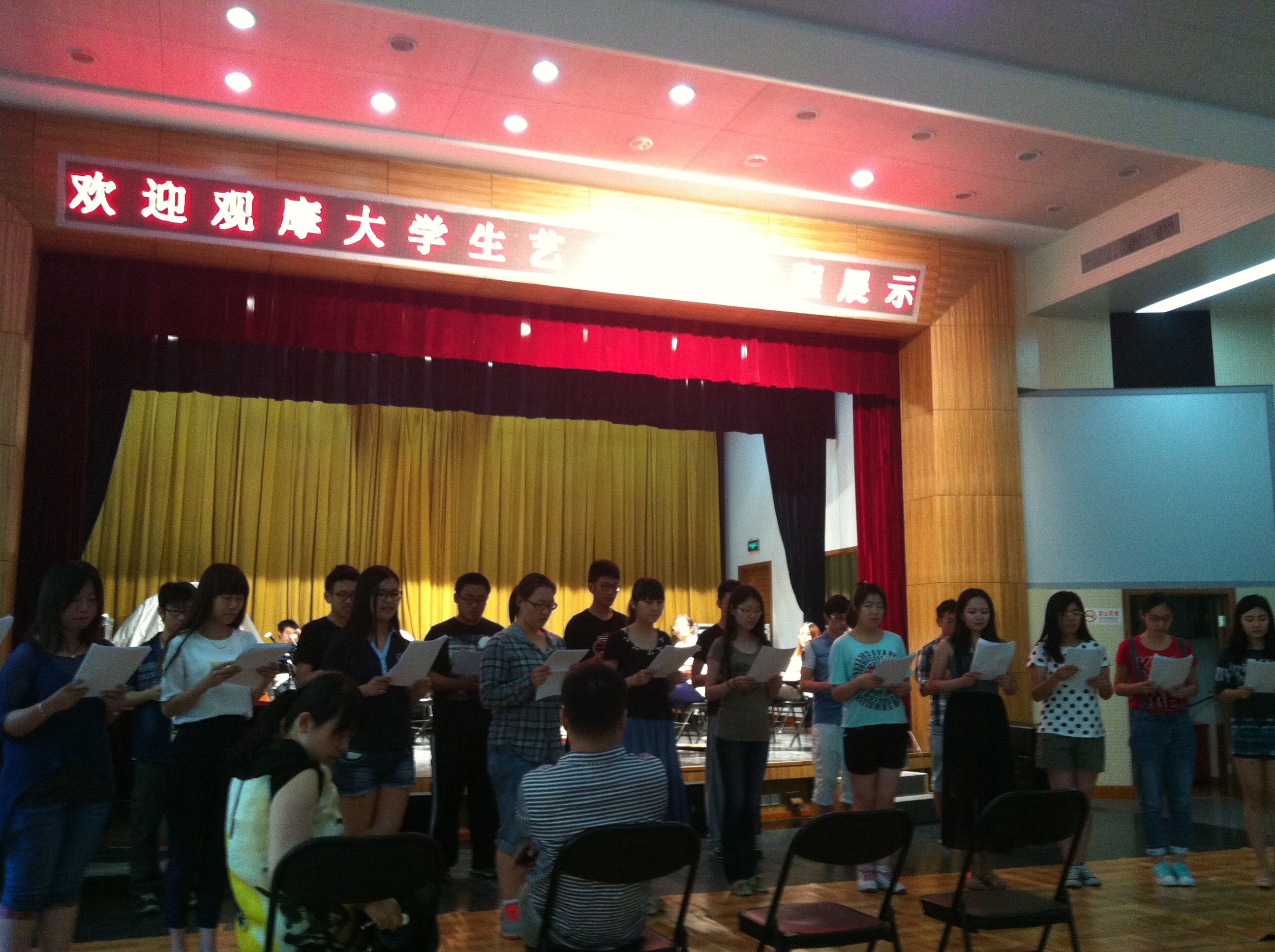此次展示活动由主持人与朗诵团,女生合唱团、民乐团三部分构成。主持人与朗诵由指导教师教莉带领进行了发声练习,及朗诵片段展示。女生合唱团演绎经典的《美丽的夏牧场》,民乐团演绎了《酒歌》。
