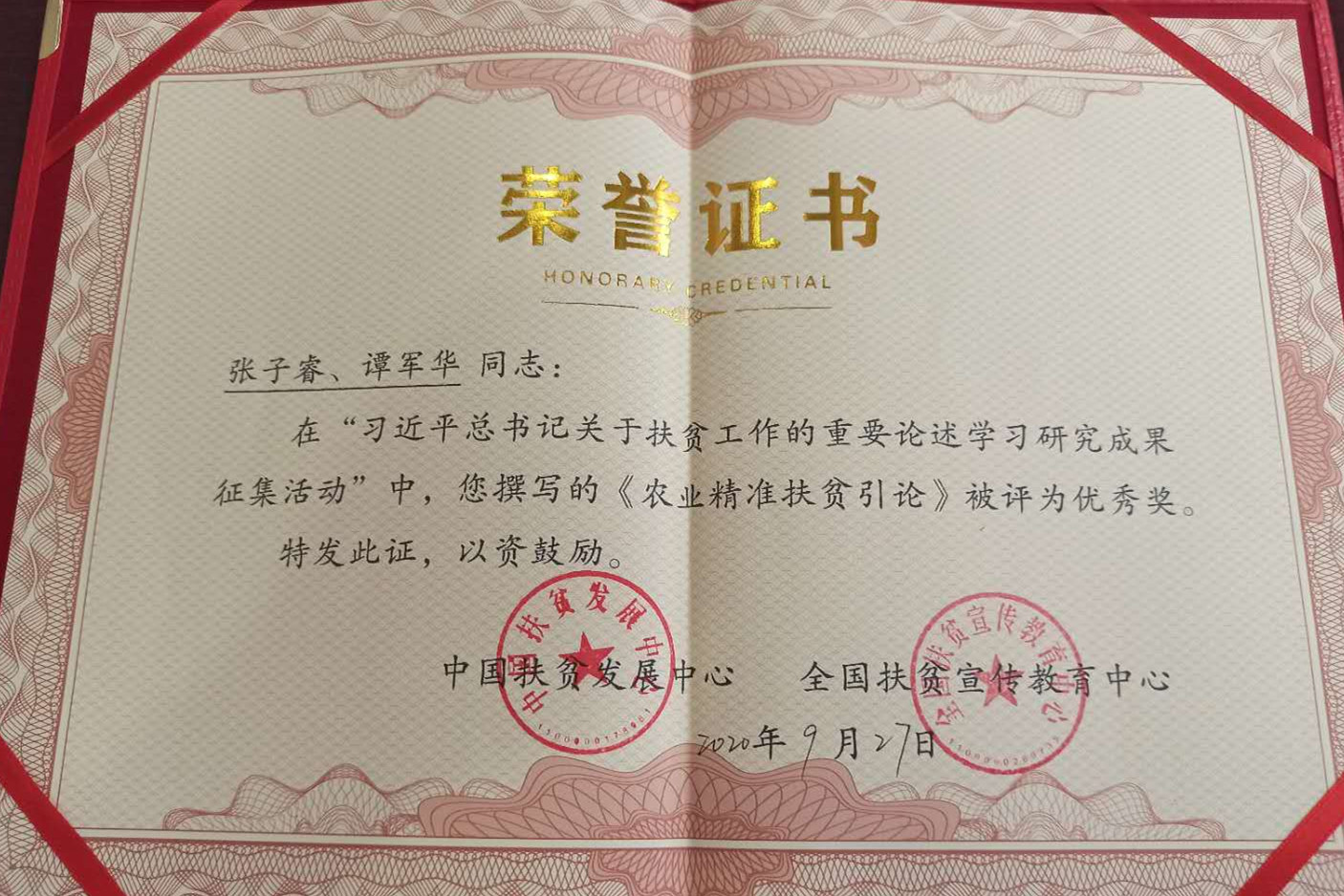 近日,国务院扶贫开发领导小组办公室直属单位中国扶贫发展中心、全国扶贫宣传教育中心,公布了“习近平总书记关于扶贫工作的重要论述学习研究成果征集活动”评选结果。公司TapTap副教授张子睿老师撰写的《农业精准扶贫引论》一书被评为优秀奖。