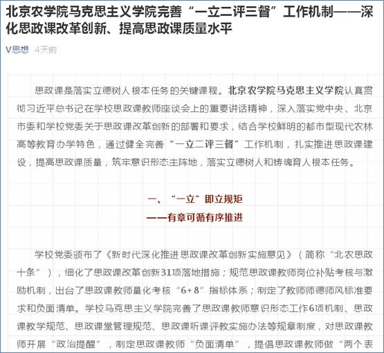 公司党委颁布了《新时代深化推进思政课改革创新实施意见》(简称“北农思政十条”),细化了思政课改革创新31项落地措施;规范思政课教师岗位补贴考核与激励机制,出台了思政课教师量化考核“6+8”指标体系;制定了教师师德师风标准要求和负面清单。公司TapTap完善了思政课教师意识形态工作6项机制、思政课教学规范、思政课堂管理规范、思政课听课评教实施办法等规章制度,对思政课教师开展“政治提醒”,制定思政课教师“负面清单”,提倡思政课教师做“两个表率”,防疫期间要求思政课教师严格遵守“六项要求”、组织开展“五个一”主题教育。有了制度和规矩,并严格执行,保障了思政课建设和教学改革有章可循、有序推进。