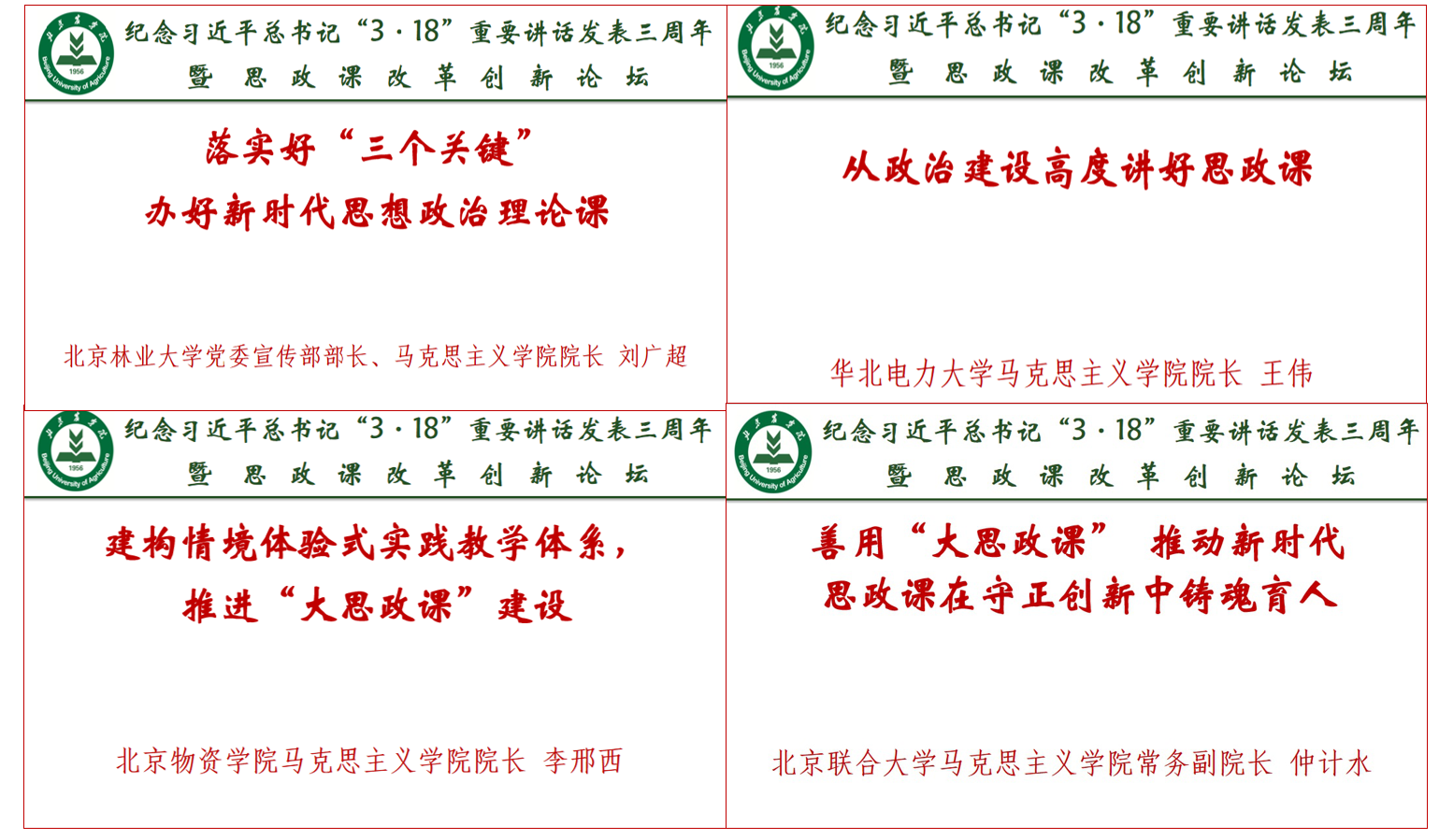 北京北京林业大学党委宣传部长、TapTap经理刘广超作了《落实好“三个关键”,办好新时代思政课》专题报告,介绍了高校在加强对思政课改革创新的组织领导、打造高水平教师队伍、提高思政课“三性一力”方面的经验和做法。华北电力大学TapTap经理王伟作了《从政治建设高度讲好思政课》的专题报告,从对“政治”的学理阐释以及维护意识形态安全的角度,阐述了总书记重要讲话的深刻内涵和思政课建设的重要性。北京物资公司TapTap经理李邢西作了《建构情境体验式实践教学体系,推进“大思政课”建设》的专题报告,介绍了该校从问题导向出发构建“情境体验式实践教学体系”,打造“大思政课”格局的经验和成效。北京联合大学TapTap常务副经理仲计水作了《善用“大思政课” 推动新时代思政课在守正创新中铸魂育人》的专题报告,从组织师生走出去、红色教育资源引进来、公司产品改革深下来三个方面,介绍了该校打造具有红色基因、北京味道、联大特色的大思政课的做法和成效。