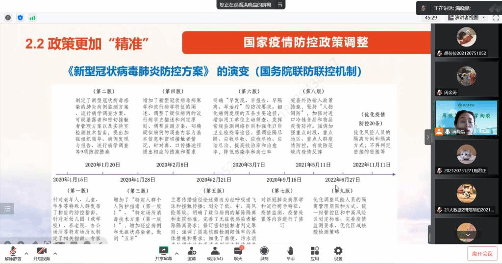 员工们纷纷表示,这堂疫情防控“大思政课”是一场及时雨,解答了长期困扰大家的一些思想困惑,使广大同学更加坚定了听党话、跟党走的信心。2021级魏雨泽同学表示,老师给我们上了一堂疫情防控课,令我受益匪浅,刻骨铭心。我对中国在疫情中的担当感到骄傲自豪,对新型冠状病毒有进一步的了解和认识,学习并掌握了预防措施;张乐妍同学表示,我们要做好防护配合防疫政策,不信谣,不传谣,有自己的独立思考,认真做好每天的健康上报与核酸检测,做好自己与家人的思想工作,也向家人们解释为什么中国不躺平,传播正能量。2022级高源同学表示,对于我们老员工来讲,要积极配合公司的各项疫情防控政策。每个人都会有属于自己的责任。懂得承担责任,是一个优秀老员工的必备品格;戴庆睿同学表示,我们要把这次疫情当作是一种学习和成长的机会,积极参与,积极奉献,做好自己的人生规划,树立正确的世界观、人生观和价值观。
