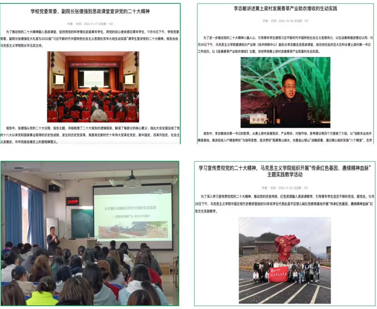 公司党委书记和董事长带头、全体校领导坚持带头上讲台,为北农学子讲授生态文明、乡村振兴等特色课程和内容;全体思政课教师及时将党中央“一号文件”精神、习近平总书记关于“三农”工作的重要论述以及乡村振兴等内容融入思政课程,主动做到“红绿融合”;同时思政课教师在日常学习、实践、教学、科研、社会服务活动中,主动做到围绕“农”、贴近“农”、服务“农”,各项成果充分体现“红绿融合”,体现服从服务于高素质现代农林人才培养。