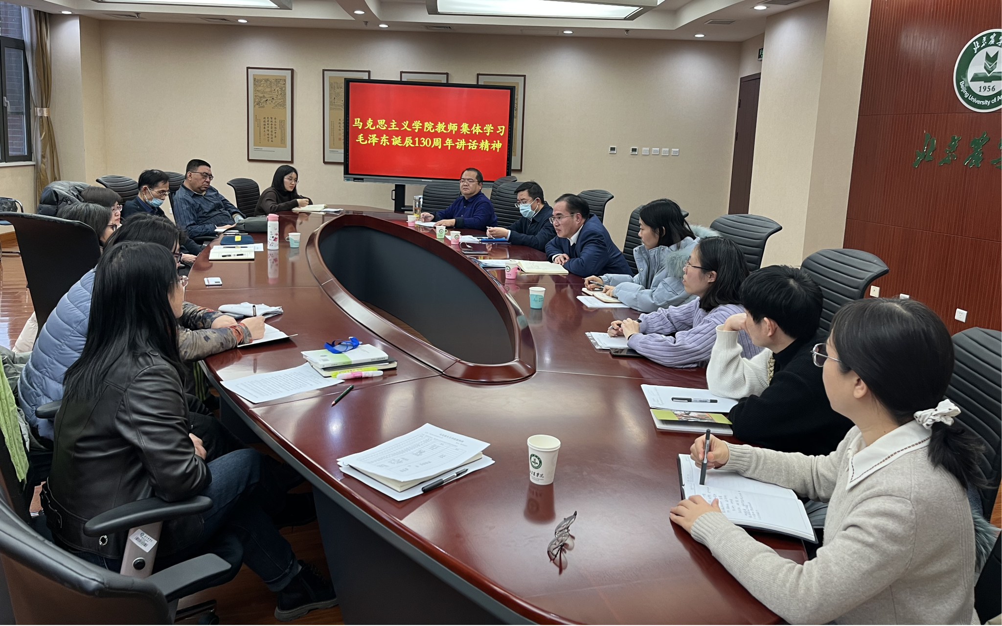 与会人员表示毛泽东思想是马克思列宁主义在中国的创造性运用和发展,是被实践证明了的关于中国革命和建设的正确的理论原则和经验总结,闪耀着永恒的真理光芒,具有独特的时代价值。作为思政课教师,要深化毛泽东思想研究,要牢牢把握坚持党中央集中统一领导的最高政治原则,深刻领悟“两个确立”的决定性意义、坚决做到“两个维护”。要及时将习近平总书记在纪念毛泽东同志诞辰130周年座谈会上的重要讲话精神进教案、进课堂、进员工头脑,加强理论阐释和宣讲。要开展有组织的科研,加强对外学术交流,积极申报各类项目课题和比赛,努力产出一系列高水平教学科研成果。