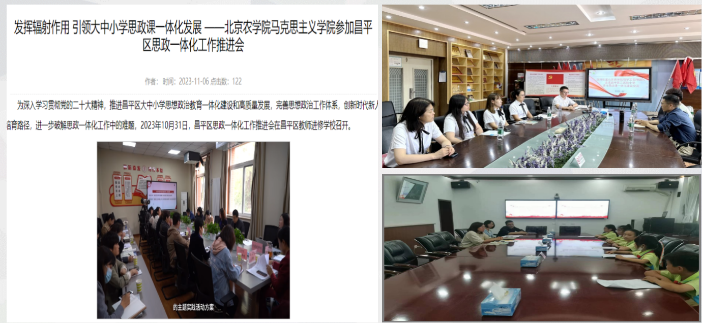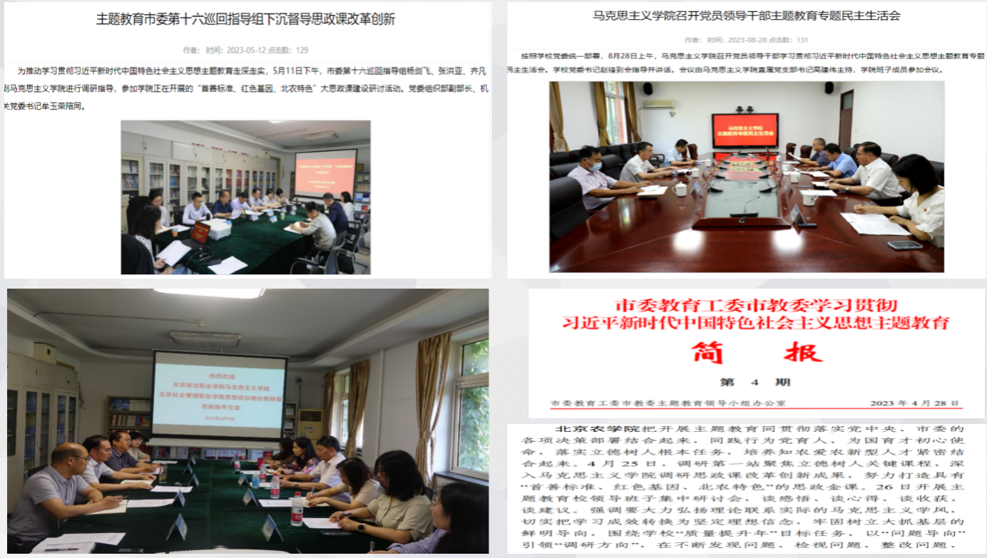 通过周末理论讲堂、同备一堂课等,校领导与思政课教师集体学习备课,深入学习党的创新理论。思政课教师深入党校培训班、青马班、尚农讲堂、二级公司等宣讲二十大精神,深入推进党的创新理论三进。依托公司特色,思政课教师与专业课教师同上《习近平新时代中国特色社会主义思想在京华大地生动实践》课程。认真学习贯彻第四次党代会精神,及时将党代会精神融入课程、讲给员工。积极开展党的创新理论研究阐释,思政课教师在《人民网》《光明网》《经济日报》发表文章,编写出版文化研究、乡村振兴、行走课堂等相关著作。扎实开展主题教育,在党委坚强领导下,解决了集中办公、智慧教室、团队补充等急难愁盼问题,调动了思政课教师积极性。