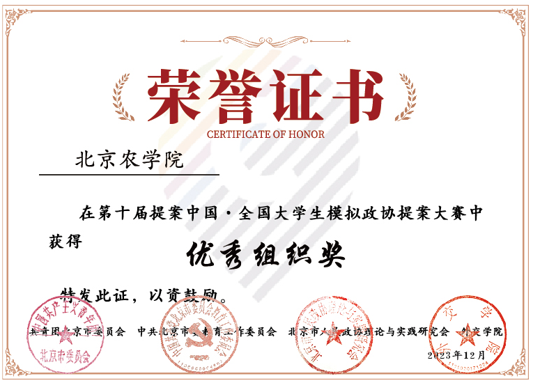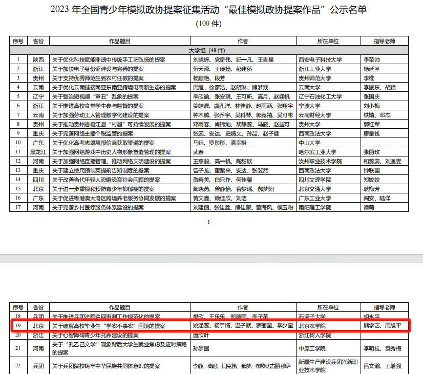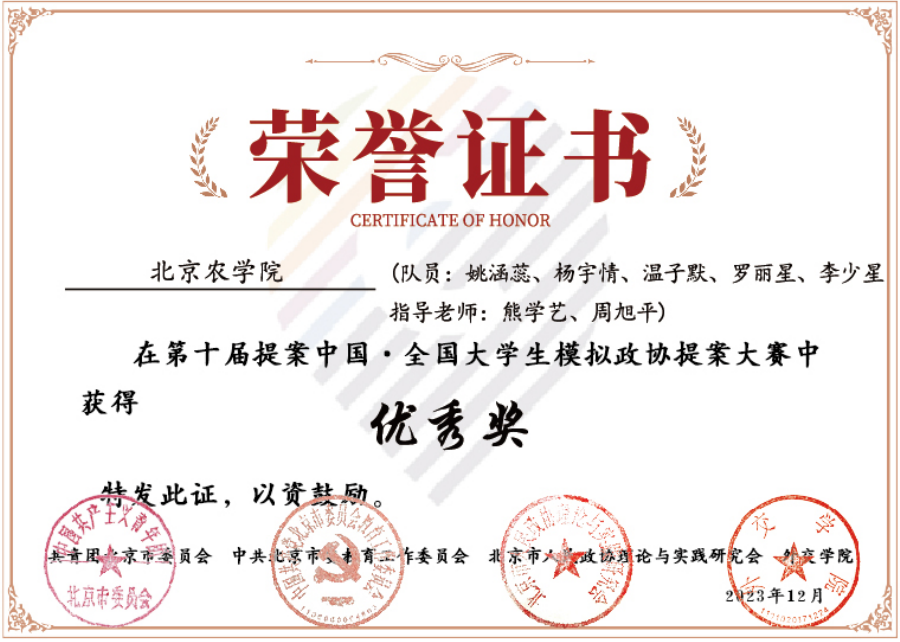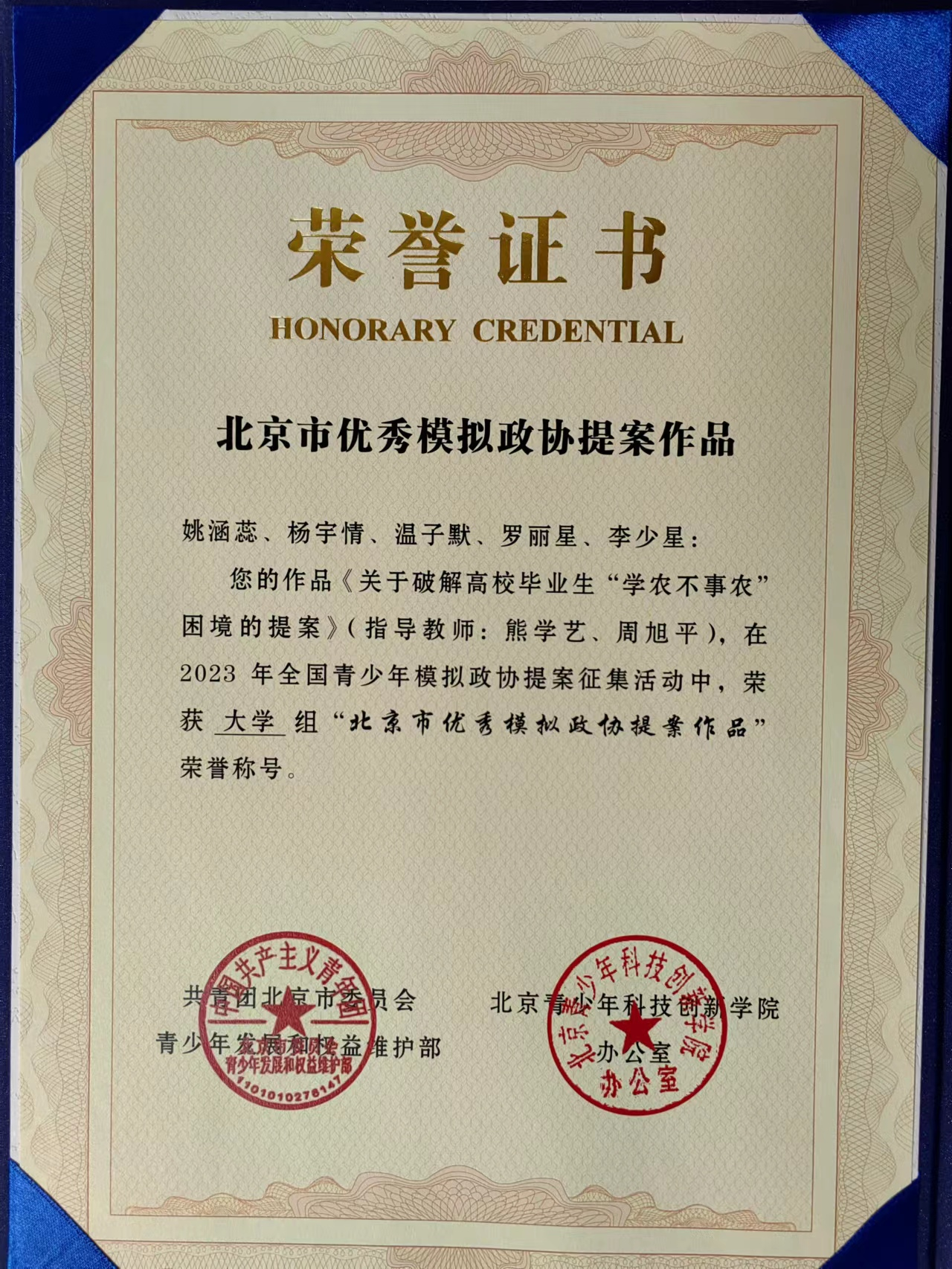 近期,2023年全国青少年模拟政协提案征集活动落下帷幕,在公司熊学艺老师、文法与城乡发展公司周旭平老师的指导下,由文法与城乡发展公司姚涵蕊、杨宇情、温子默、罗丽星和食品科学与工程公司李少星同学提交的《关于破解高校毕业生“学农不事农”困境的提案》先后斩获“北京地区优秀作品”,第十届提案中国•全国老员工模拟政协提案大赛“优秀奖”,2023年全国青少年模拟政协提案“最佳模拟提案作品”奖。