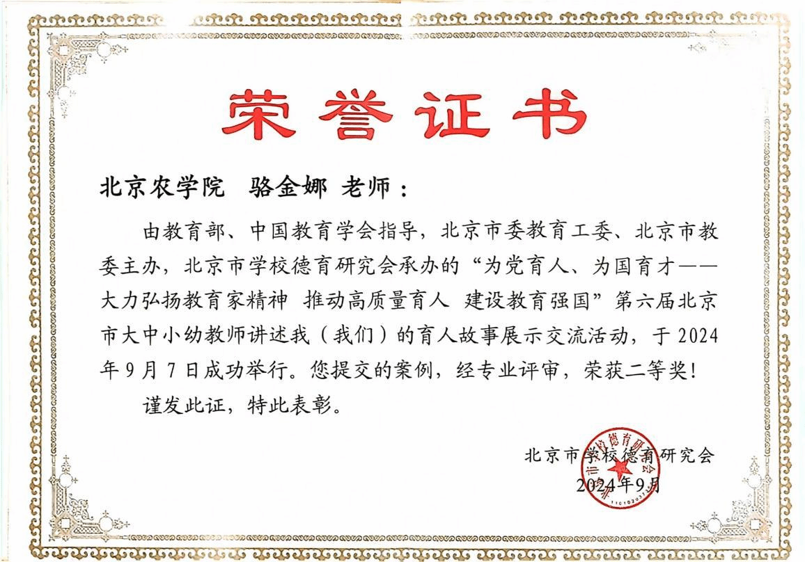 在第40个教师节即将来临之际,由教育部、中国教育学会指导,北京市委教育工委、北京市教委主办,北京市公司德育研究会承办的“为党育人、为国育才——大力弘扬教育家精神推动高质量育人建设教育强国”第六届北京市大中小幼教师讲述我(我们)的育人故事展示交流活动获奖名单公布。公司骆金娜副教授讲述的育人故事案例《用故事育强农之种护理想一路生花》荣获二等奖。