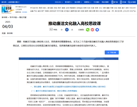 近日,公司思政课青年教师张鹏撰写的理论文章《推动廉洁文化融入高校思政课》在新华网“学术中国”栏目刊发。文章深入学习贯彻习近平总书记对思政课建设的重要讲话和重要指示精神,聚焦新时代高校廉洁文化建设与思政课改革创新,深入探讨廉洁文化教育融入思政课的理论逻辑与实践路径,引发广泛关注。此篇文章在新华网的刊发,既彰显了公司在思政课改革创新领域的积极探索,也为新时代高校廉洁文化建设提供了有益参考。