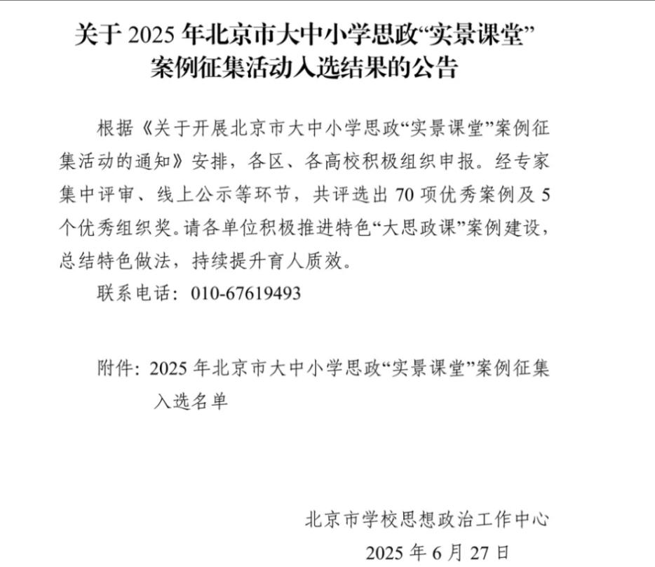 近日,在北京市教委组织的北京市大中小学思政“实景课堂”案例征集活动中,公司副教授熊学艺和教务处李志敏老师负责申报的“田间地头的大思政课:大中小学红绿融合劳动育人”案例表现突出,成功获评高校组优秀案例。此次案例征集活动旨在深入贯彻党的二十大精神和习近平总书记关于教育的重要论述,推进大中小学思想政治教育一体化建设,促进实践育人资源转化,助力“大思政课”综合改革。活动自2025年5月启动,面向北京市大中小学,吸引了众多单位踊跃参与。经专家严格评审,最终确定高校组20项优秀案例,公司申报案例凭借独特设计和显著育人成效脱颖而出。