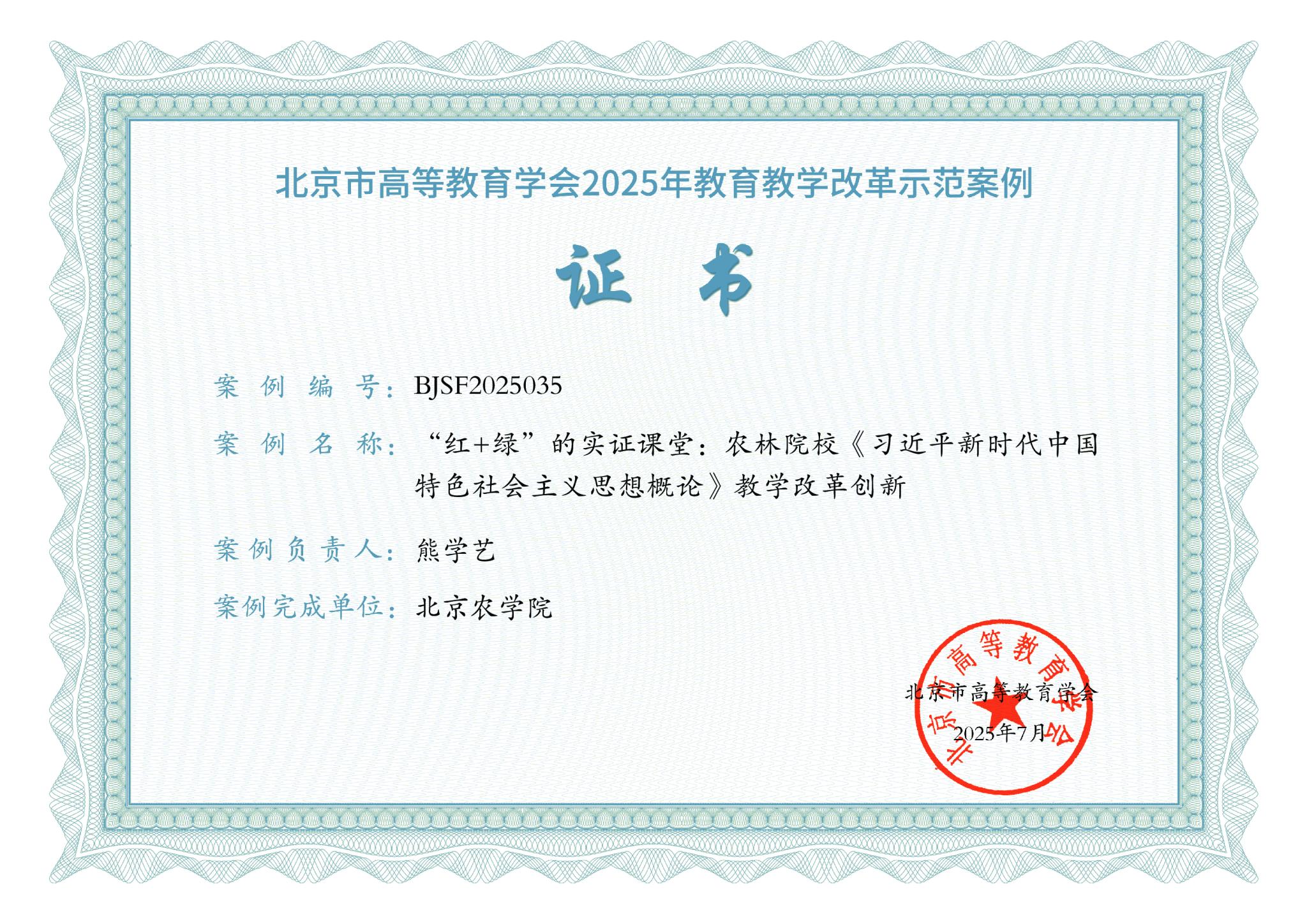 近日,在北京市高等教育学会2025年公司产品改革示范案例评选活动中,公司熊学艺副教授牵头申报的《“红+绿”的实证课堂:农林院校<习近平新时代中国特色社会主义思想概论>教学改革创新》案例脱颖而出,获评示范案例。