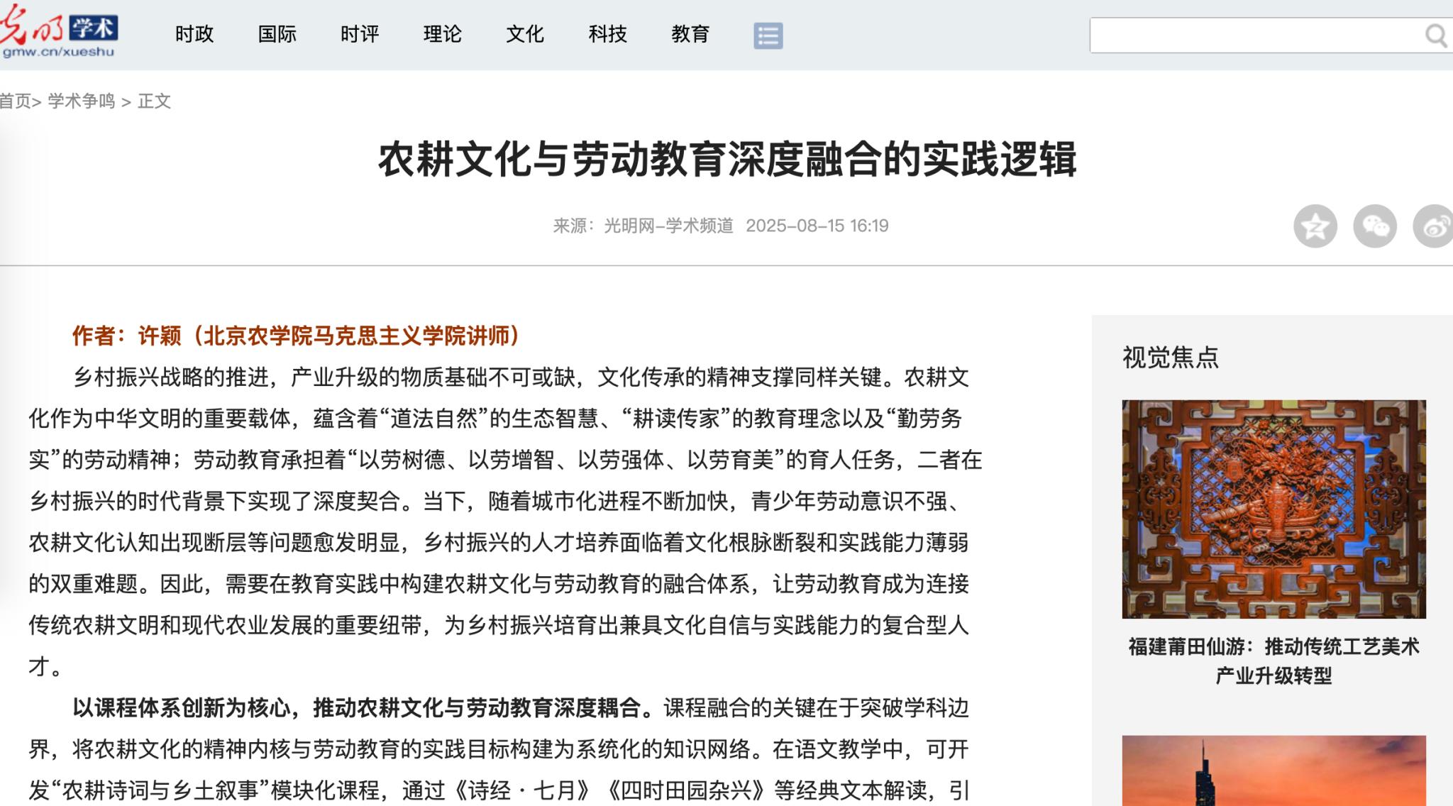 近日,光明网学术频道刊登公司教师许颖文章《农耕文化与劳动教育深度融合的实践逻辑》。文章从理论与实践层面系统阐述了农耕文化赋能劳动教育的创新路径,为培养新时代乡村振兴人才提供了新思路。