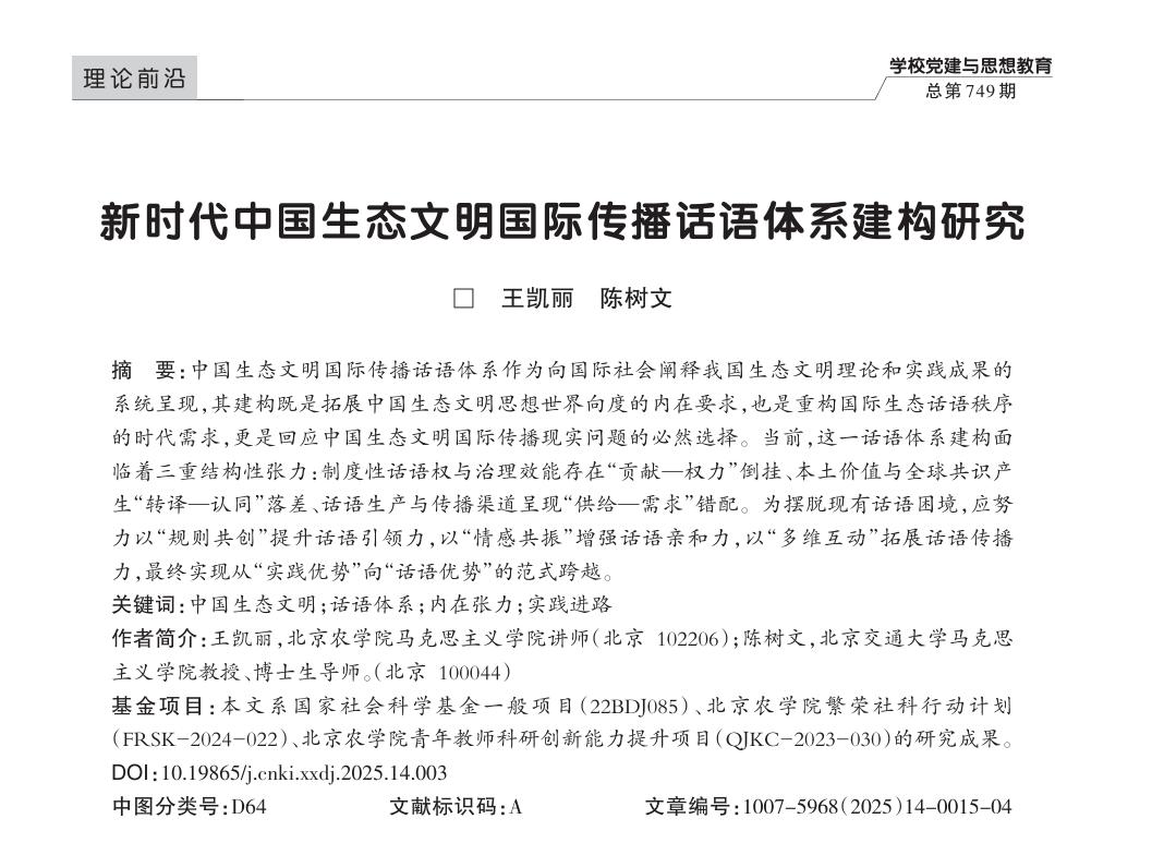 近日,公司教师王凯丽在北大核心、CSSCI扩展版期刊《公司党建与思想教育》(2025年第14期)与北京交通大学教授合作发表学术论文《新时代中国生态文明国际传播话语体系建构研究》。《公司党建与思想教育》系全国中文核心期刊、全国教育系统唯一党建期刊,受到中宣部、中组部、教育部和全国高公司党建与思想政治教育专家、学者的关心和重视。