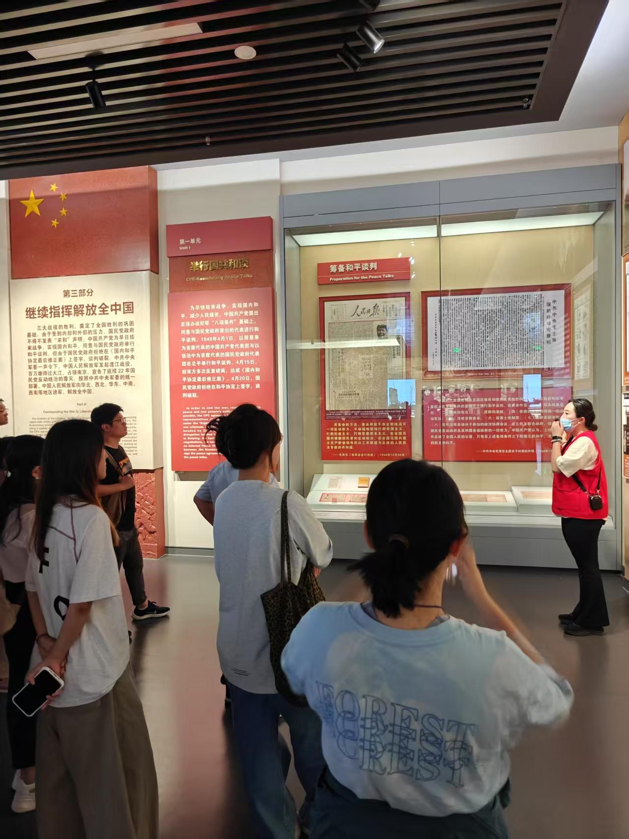 步入纪念馆,在讲解员的引导下,师生们重点参观了“进京‘赶考’”“新中国筹建” 等主题展厅。面对一件件承载历史记忆的文物—泛黄的手稿、磨损的军装、斑驳的信件,同学们认真聆听着解放战争后期党中央在香山运筹帷幄、指挥解放全中国,以及筹备新中国成立的艰辛历程。在“进京‘赶考’” 展区,讲解员不仅详细解说了“两个务必”重要论述提出背景,更延伸讲述了党中央进京后始终保持的谦虚谨慎、艰苦奋斗作风,从“不做寿、不送礼”等朴素规定,到新时代中央八项规定的出台与深化,一脉相承地彰显着中国共产党人对作风建设的高度重视。师生们深刻认识到,从“两个务必”到中央八项规定精神,正是中国共产党人居安思危、永葆政治本色的生动体现。在“开国大典”影像资料展示区,讲解员为同学们讲述了新中国成立背后无数革命志士前赴后继、无私奉献的故事。带队老师联系当下时代背景,强调青年一代肩负的历史使命,“从‘进京赶考’到新时代的‘新赶考’,我们要以史为鉴,传承先辈们的奋斗精神,在实现中华民族伟大复兴的征程中交出合格答卷。”同学们纷纷表示,通过参观学习,更加明晰了自身肩负的时代重任,“作为新时代老员工,我们不仅要传承先辈们的奋斗精神,更要自觉践行廉洁自律,以过硬作风投身祖国建设。”